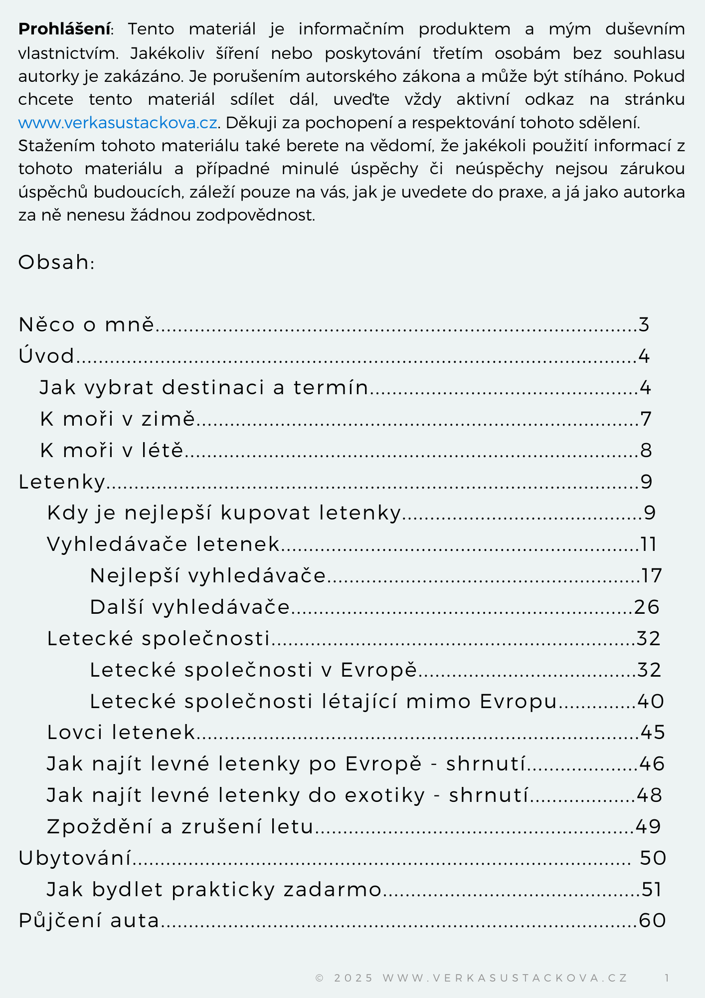 Koupíte si ho jen jednou, ale čerpat z něj informace, rady a tipy můžete při každé další cestě. Navíc budete dostávat všechny jeho budoucí aktualizace a rozšíření ZDARMA. Svět cestování se neustále mění a co platilo před pár lety, už neplatí dnes. Letecké společnosti zavádějí nové linky, mění podmínky pro cestování se zavazadly, vznikají nové možnosti ubytování, a proto eBook každé dva roky aktualizuji a rozšiřuji. Začínala jsem na 60 stranách, teď v nejnovější aktualizaci pro rok 2025 jich je přes 100 :-).