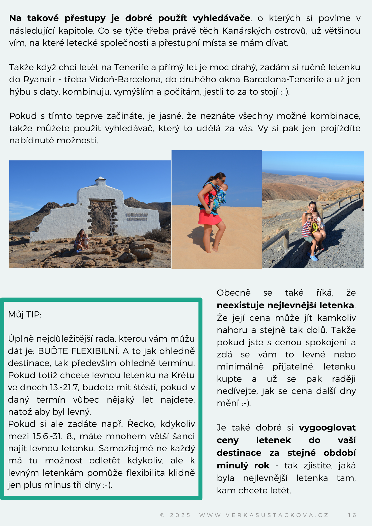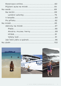 Toto všechno se naučíte, pokud si eBook přečtete. Rozdělila jsem jej do několika kapitol, které obsahují podrobné informace, praktické rady z praxe i mnoho vlastních vychytávek a tipů, které jsem posbírala během 10 let mého cestování s dětmi. To vše je doplněno o screeny, abyste měli přesnou představu, jak při organizaci cesty postupovat.
